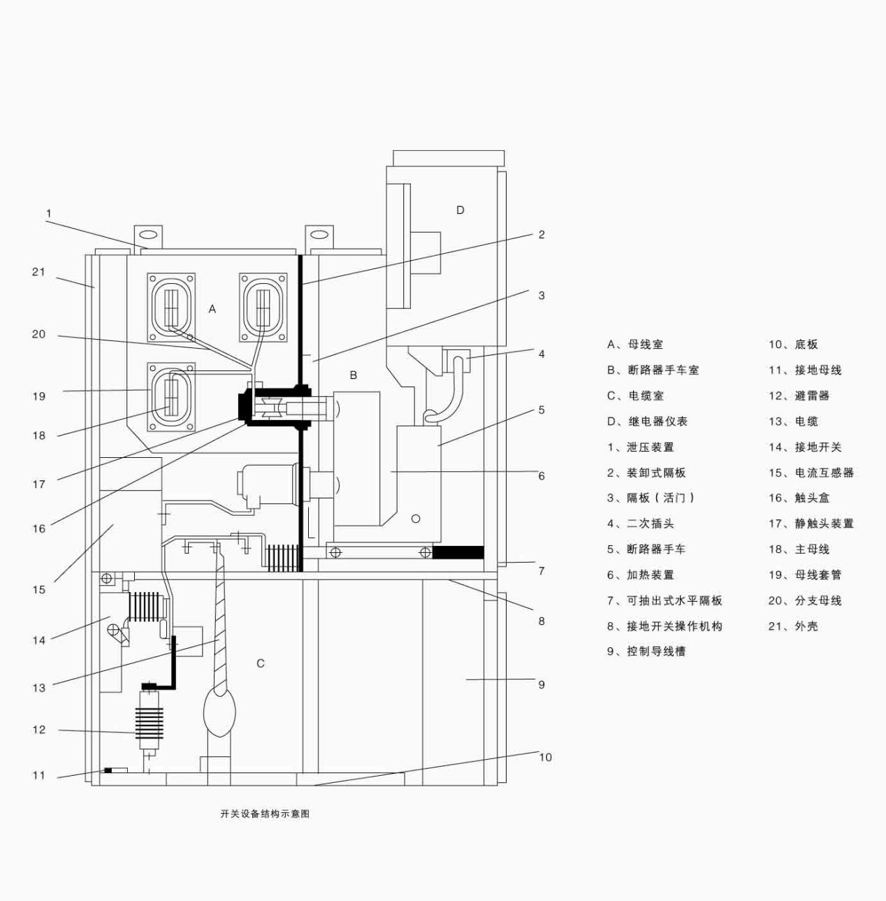 3.電纜室可裝多達9根單芯電纜,設備有可靠的機械、電氣聯鎖裝置,完全滿足“五防”要求。各室設有泄壓通道,確保運行人身安全。